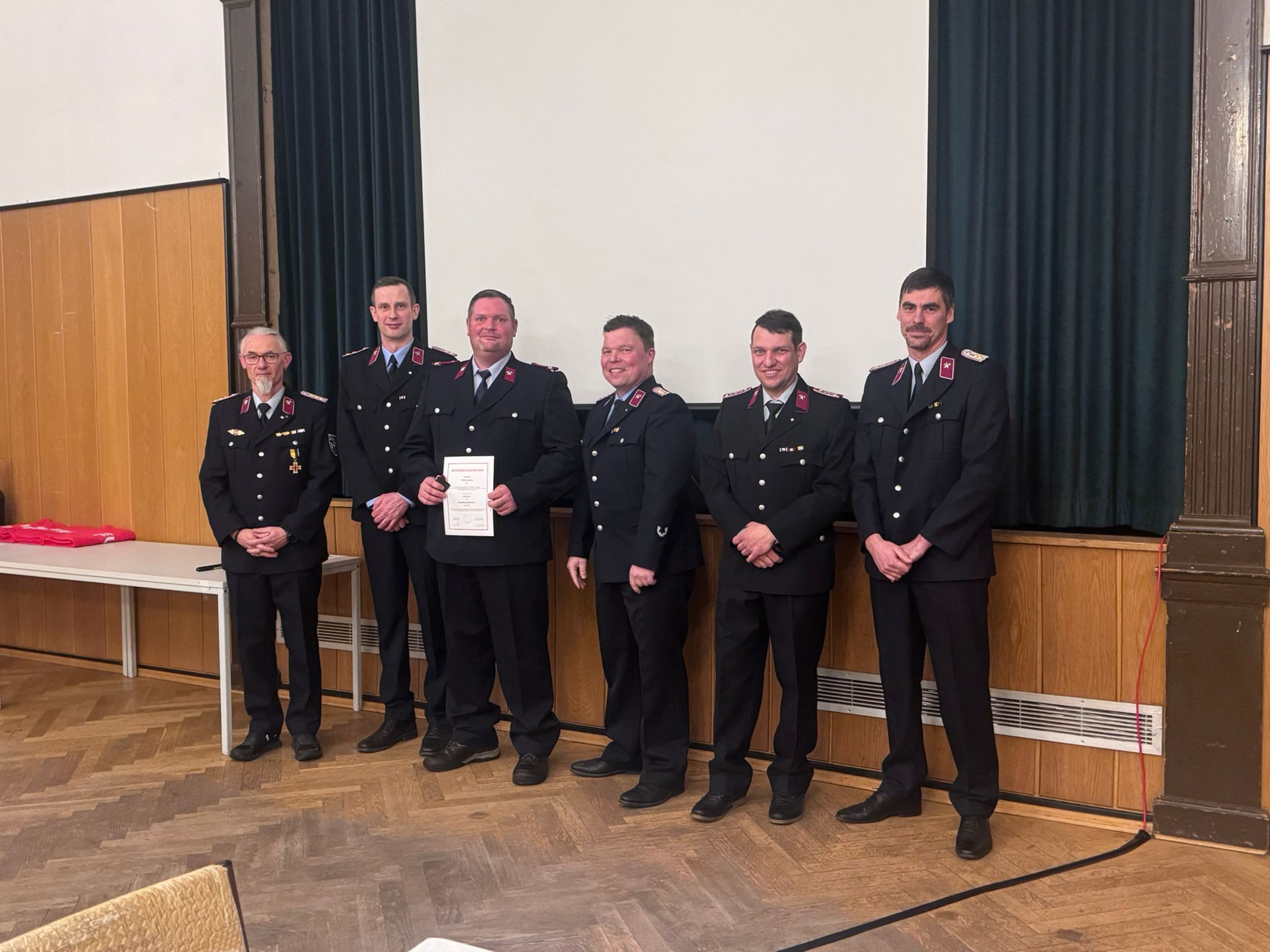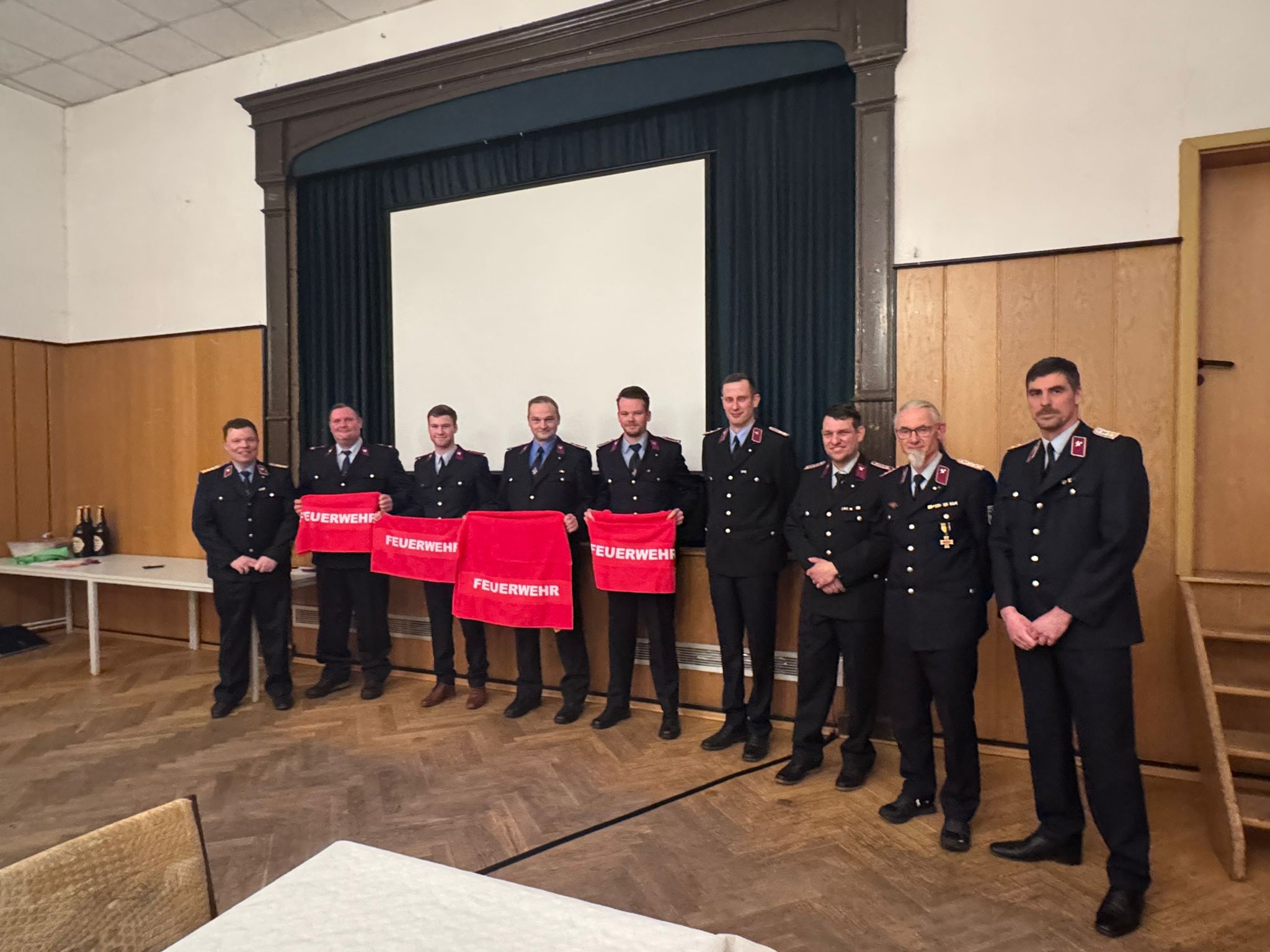 Beförderungen erfolgten u. a. zum/zur Feuerwehrmann/-frau (Marcus Richter, Sören Spring, Selina Ahlfänger), zum Oberfeuerwehrmann (Tobias Muskulus, Steffen Brauckhoff), zum Hauptfeuerwehrmann (Robert Zander) sowie zum Löschmeister (Marvin Traulsen, Tim Hertel).